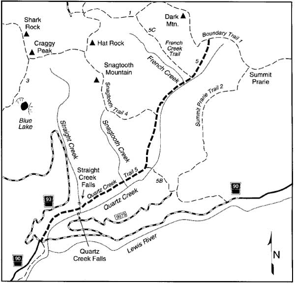 Access: Sec. 18 T8N, R8E - Road access from Eagle Cliff Bridge on Forest Road 90 to Quartz Creek. Follow Trail #31 downstream about 1 mile to the falls.