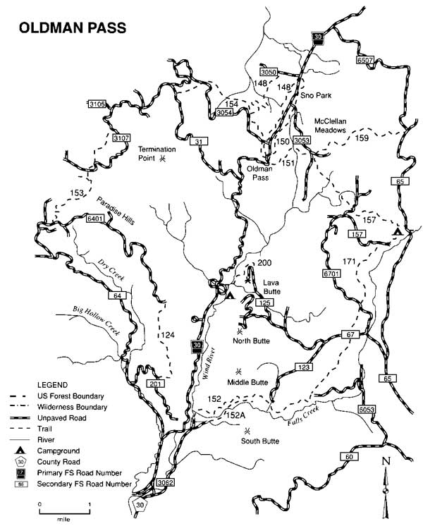 Access: Oldman Pass (R7E, T6N, Sec 23) is accessed by the Wind River Hwy (30 Rd.).