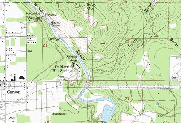 The Natural Hot Springs on the east side of the Wind River near Carson are a popular destination. Unfortunately, access from either side of the river is very hazardous, several injuries and deaths have occurred in this area